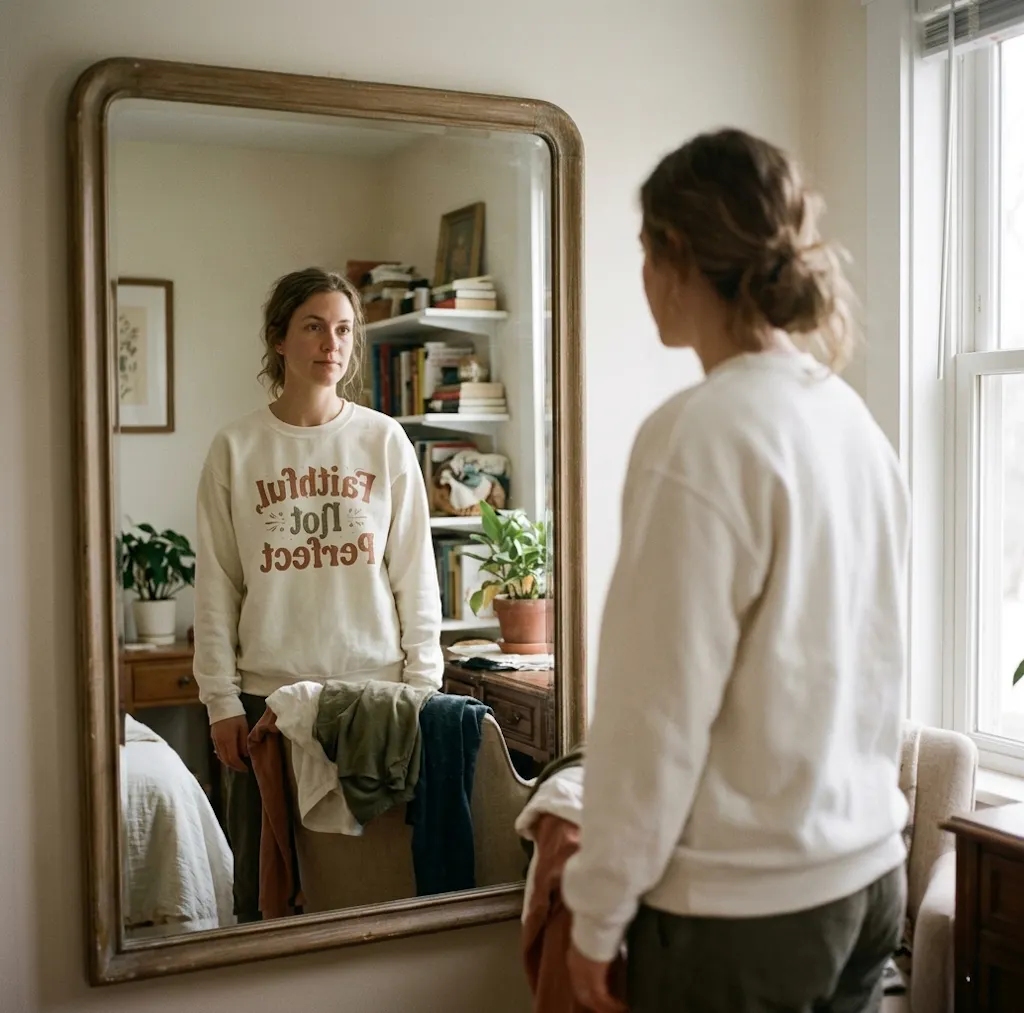 You know that woman who holds herself to impossibly high standards, quietly beats herself up when she falls short, and somehow keeps showing up anyway? This sweatshirt is for her. It’s cozy, it’s beautiful, and it says the thing she needs to hear in three words she’ll carry with her all day. Faithful. Not. Perfect. Give it to her and watch her shoulders drop about two inches with relief. That’s the gift.