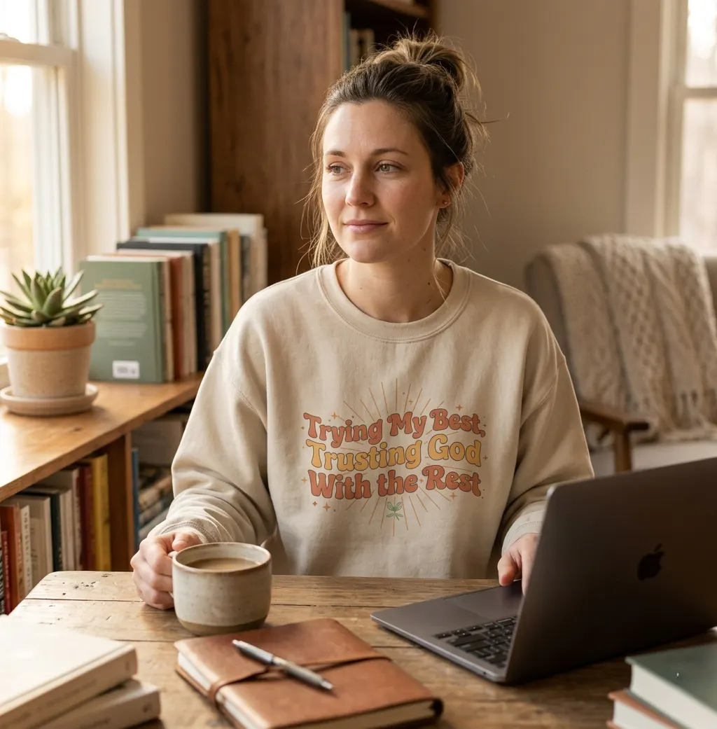 For the woman who works hard, prays harder, and is slowly gracefully learning that she doesn’t have to do both at the same time. She tries her best. She really does. And this sweatshirt celebrates that beautifully while reminding her that the rest was never hers to carry alone. Warm, retro, cozy, and the most honest thing she’ll read all week. She will wear this constantly. You will get full credit. This is the gift.